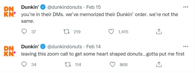 In contrast, Dunkin’s Twitter account exemplifies Charest’s 4Is: involvement, interaction, intimacy (affinity), and influence (532). Of these, “intimacy” is the most important; the account relies heavily on the “millennial relatability” posts earlier described. In so doing, Dunkin’ seeks to create a sense of affinity and intimacy among its followers; the centrality of Dunkin to New England life, for example, means that many of their New England-based followers feel a real affinity towards the idea of “when your Dunkin’ order is 98% of your personality.” This type of tweet also works towards involvement and interaction; every tweet invites a flood of responses – agreement, questions, critiques, and so on. The fourth I, influence, appears to be the weakest link on their Twitter page. However, they do have promos, occasional special app codes (which are quickly snapped up), and rare cross-brand engagement, all of which could be seen as a means of influencing their customers to respond to their tweets in very specific ways.