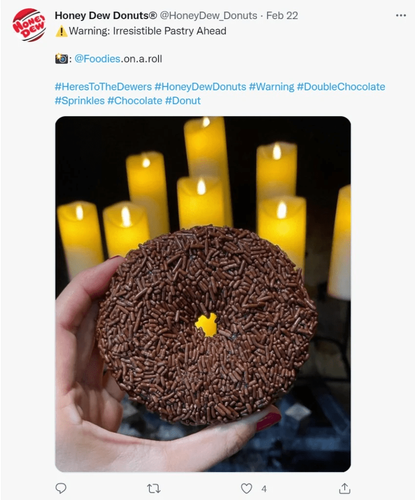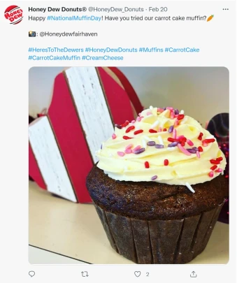 As mentioned earlier, Dunkin’ and Honeydew have a number of similarities. However, Dunkin’ is an international brand, whereas Honeydew is regional and found only within New England. This clearly affects their respective SM strategies. Dunkin already has strong market recognition, so they are able to spend a lot less time on product promos; they only seem to call out specific products, such as merch or salted caramel, because they are new and/or unusual. Instead, their SM account focuses on the use of humor as an avenue for building community. Most tweets, while they do reference Dunkin products, rarely have specific products to push. The “voice” of their Twitter account aims to create a “Dunkin’ lifestyle,” delivered in a light-hearted and engaging manner, with such tweets as “my first sip of Dunkin’ is a core memory for me.”