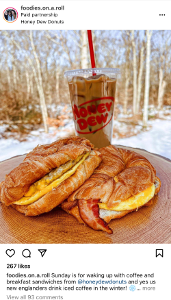 Honeydew engages in “social listening,” as described by Mary Lorenz, in ways that are more immediately obvious on their Twitter timeline than is the case for Dunkin’, who likely engage in more “behind the scene”-type listening projects. For Honeydew, this is particularly true with regards to brand management, which Lorenz describes as understanding “how audiences feel about their [brand] (what they love about it, what they don’t love, etc),” as seen in their current top post, which is an response to a January tweet from a customer who praised their breakfast sandwiches. Honeydew also engages in what Francine Charest et al describe as “3 Level Planning” – trust capital, attachment/transparency, and common cause (531). They build “trust capital,” their identity and reputation, with photos of actual in-store items. They also work on creating attachment through their reliance on SM influencers; the main influencer appears to be “foodies.on.a.roll,” who have an Instagram presence of 14.4k followers and who are located in New England. It’s not immediately clear that “foodies.on.a.roll” are paid collaborators; they are never identified as such on Honeydew’s Twitter account. However, further research uncovered their relationship when their Insta account was examined. Finally, Honeydew is engaged in the 3rd level of strategic planning, as described by Charest, et al, which is “common cause.” Honeydew, with their “Dew Good” contest, gave away $5000 to each winner (five in all) plus another $5000 to a charity of the winners’ choice. While this allowed them to engage with, and reward, members of their communities for having a positive impact, it also allowed Honeydew to build on their local brand recognition and reputation.