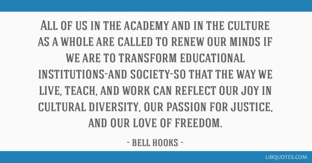 …any radical pedagogy must insist that everyone’s presence is acknowledged. That insistence cannot be simply stated. It has to be demonstrated through pedagogical practices.